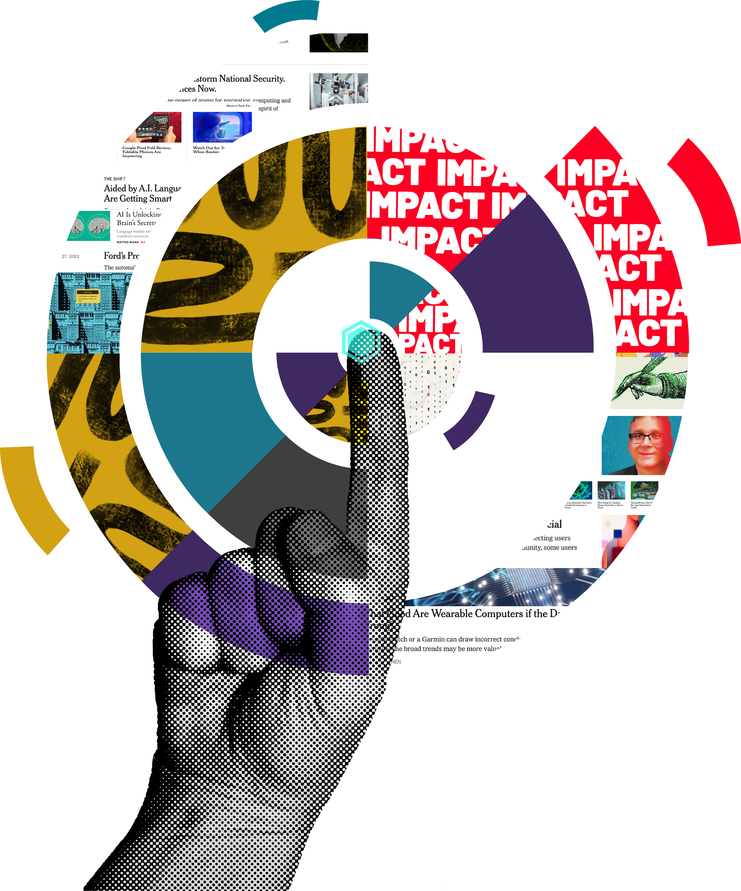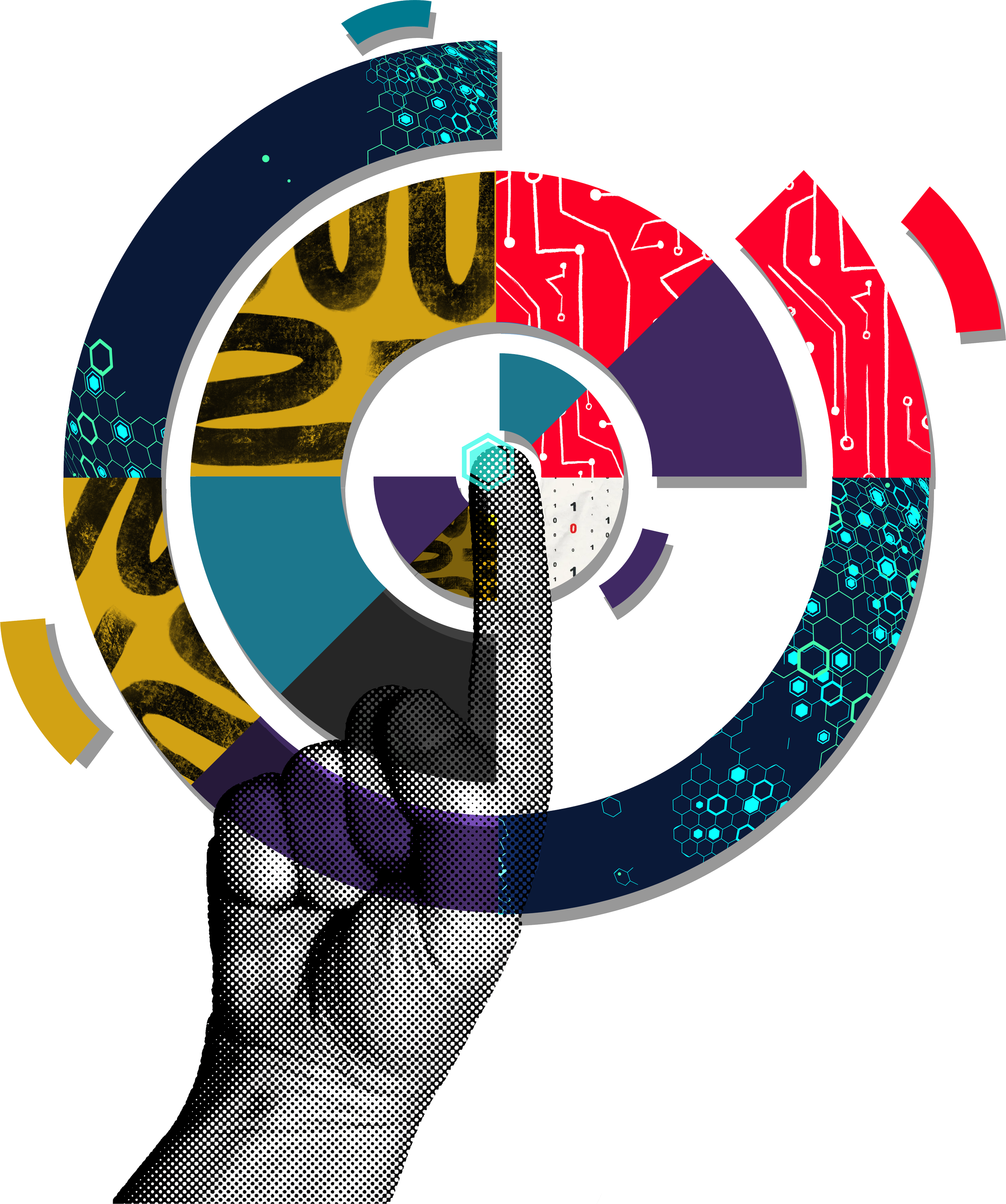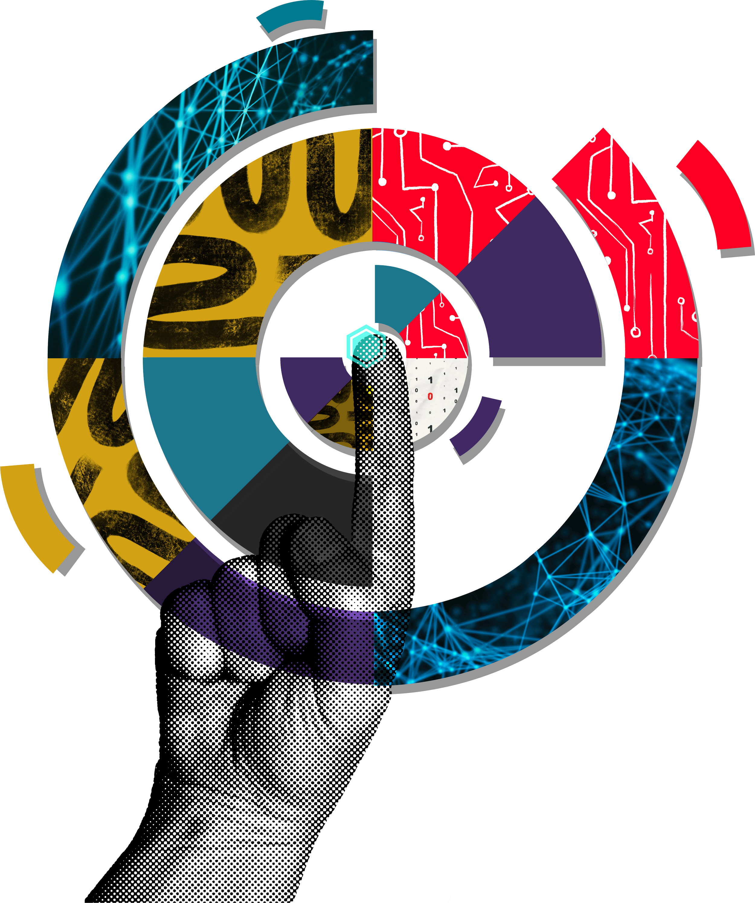 Better ideas did form once a particular design was chosen. To combat personal biases, I shared my ideas with my fellow designer and marketing colleagues. The pointer finger was majority agreed that it felt similar to the experience of pressing onto a screen that would then explode into various technological and futuristic elements like glitches, digitized textures, arrows, robotic features, and more.
